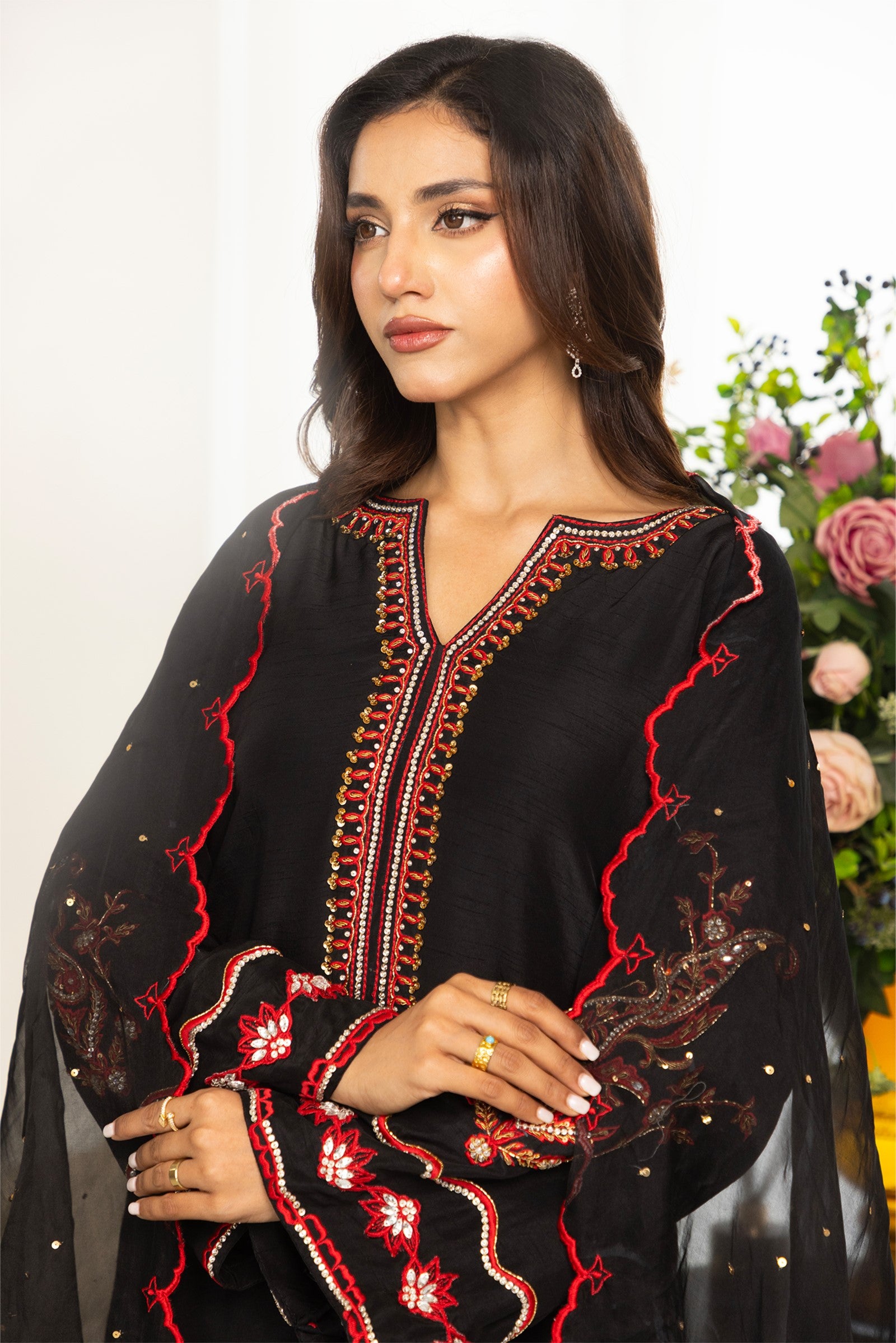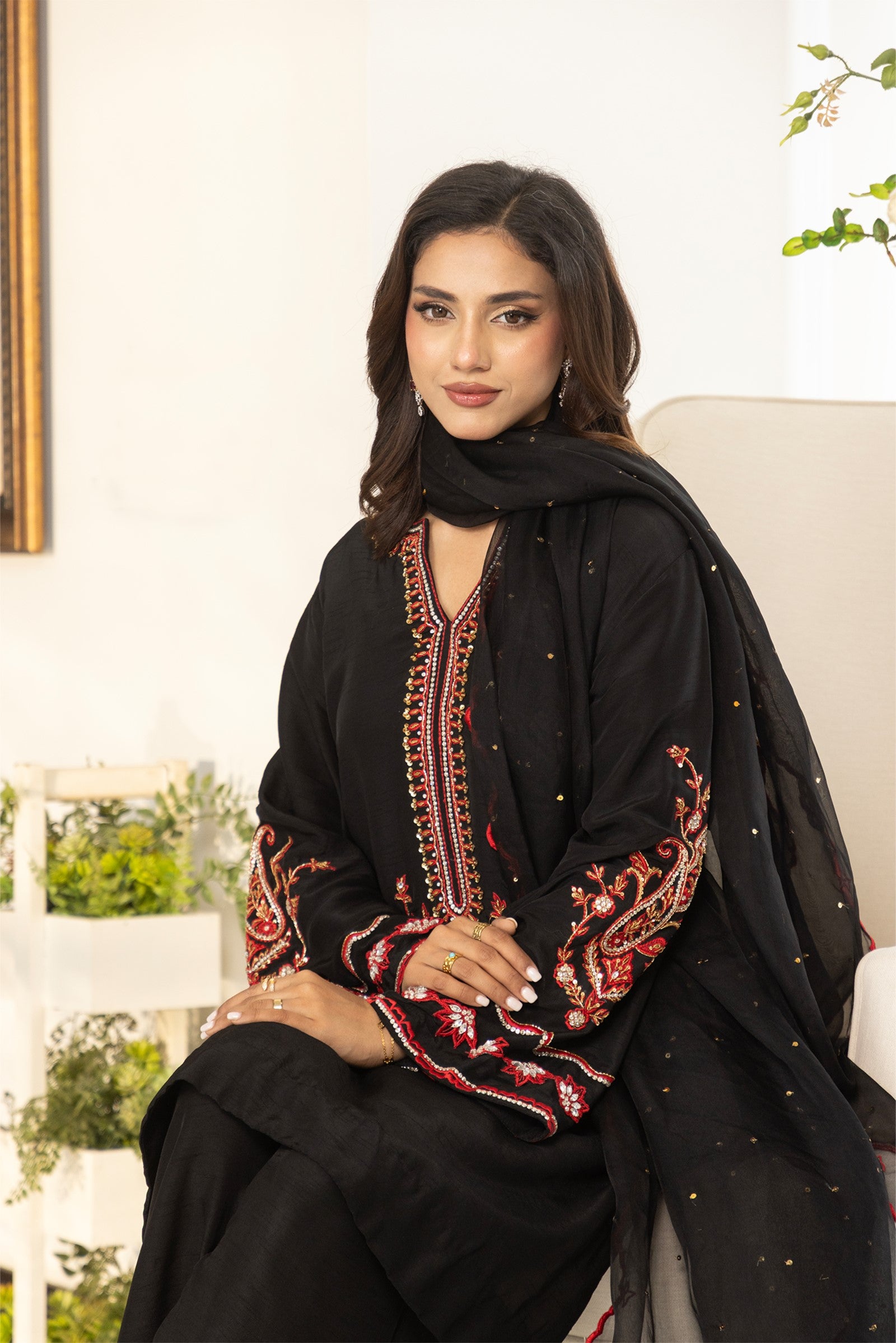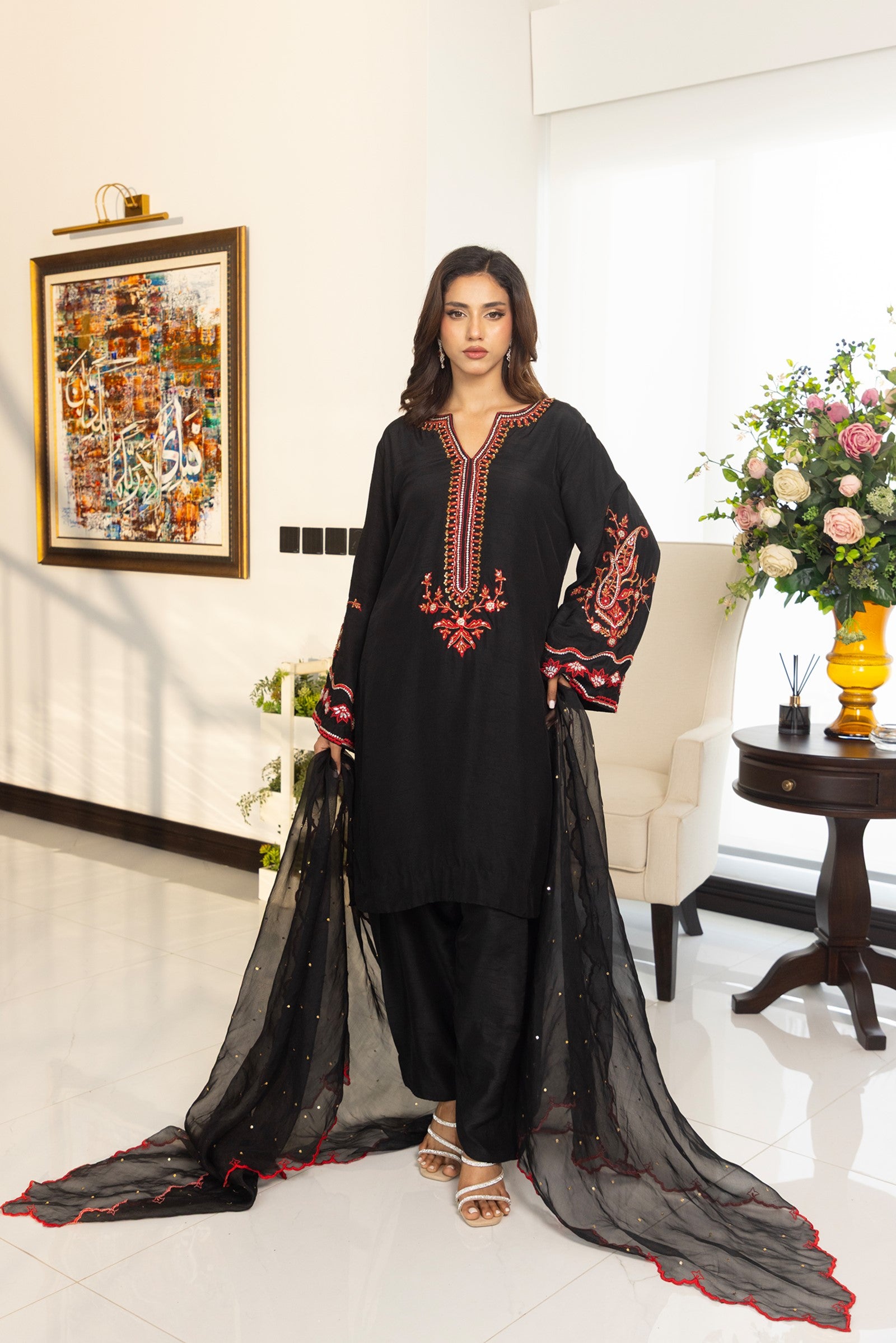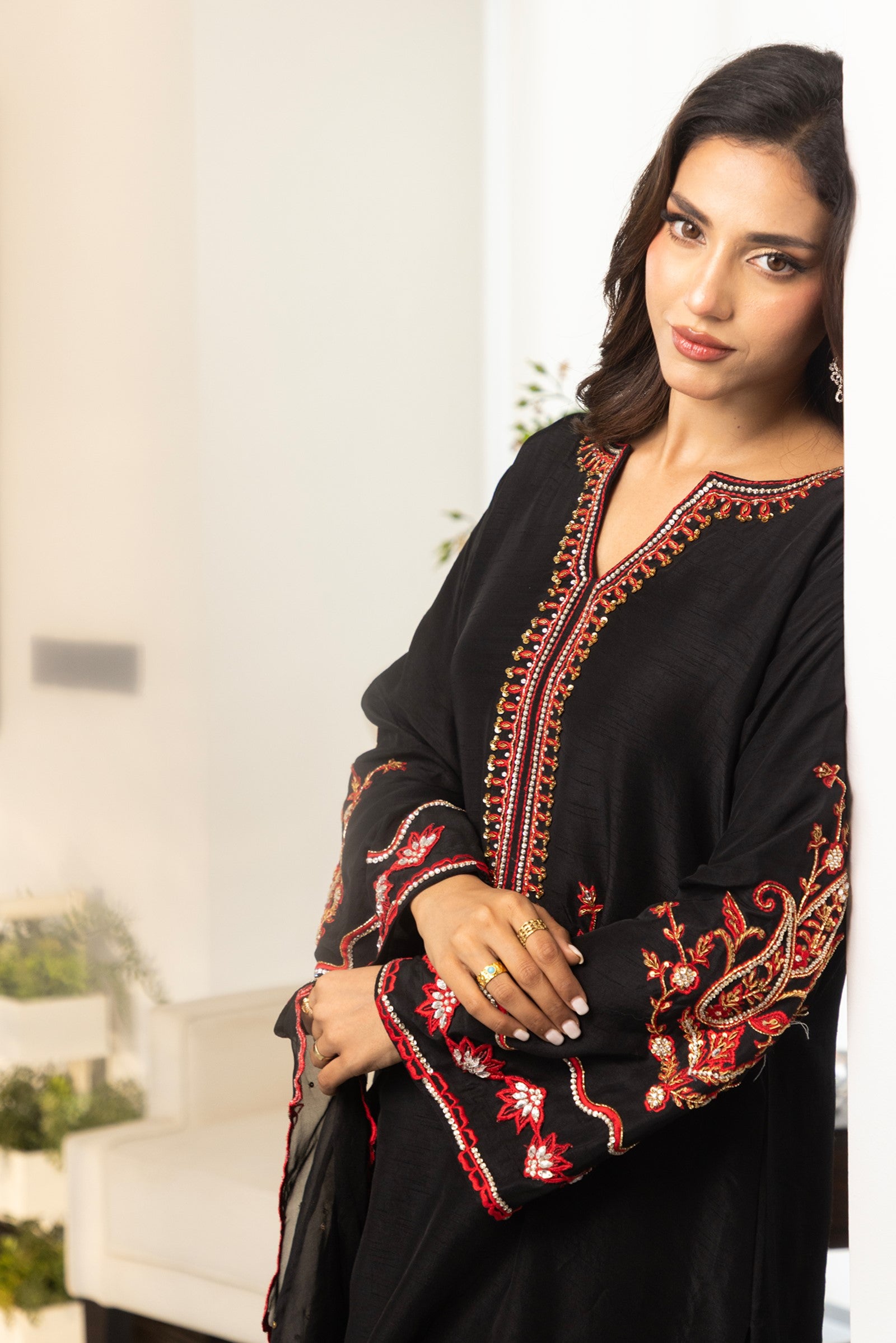 Crafted in Korean raw silk, this elegant 3-piece ensemble features rich red resham embroidery with intricate hand-embellished stones, sequins, cutdana and dabka work on the shirt. Paired with matching Korean raw silk pants and a sheer organza dupatta adorned with resham embroidery and scalloped edges, this outfit is perfect for festive gatherings and evening celebrations.