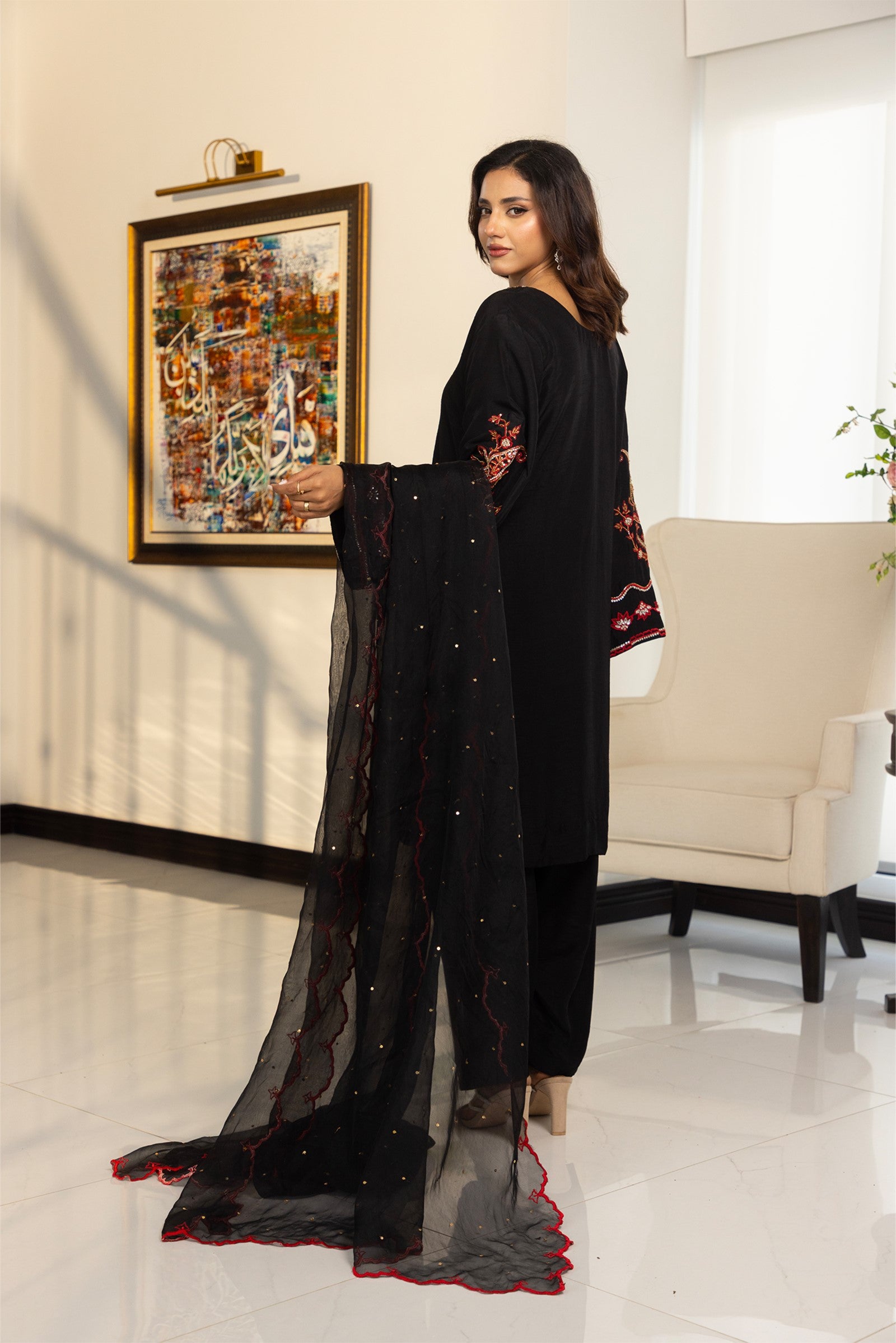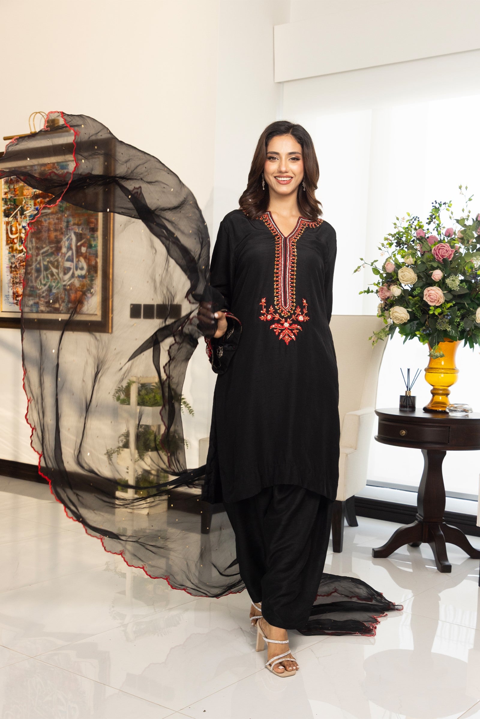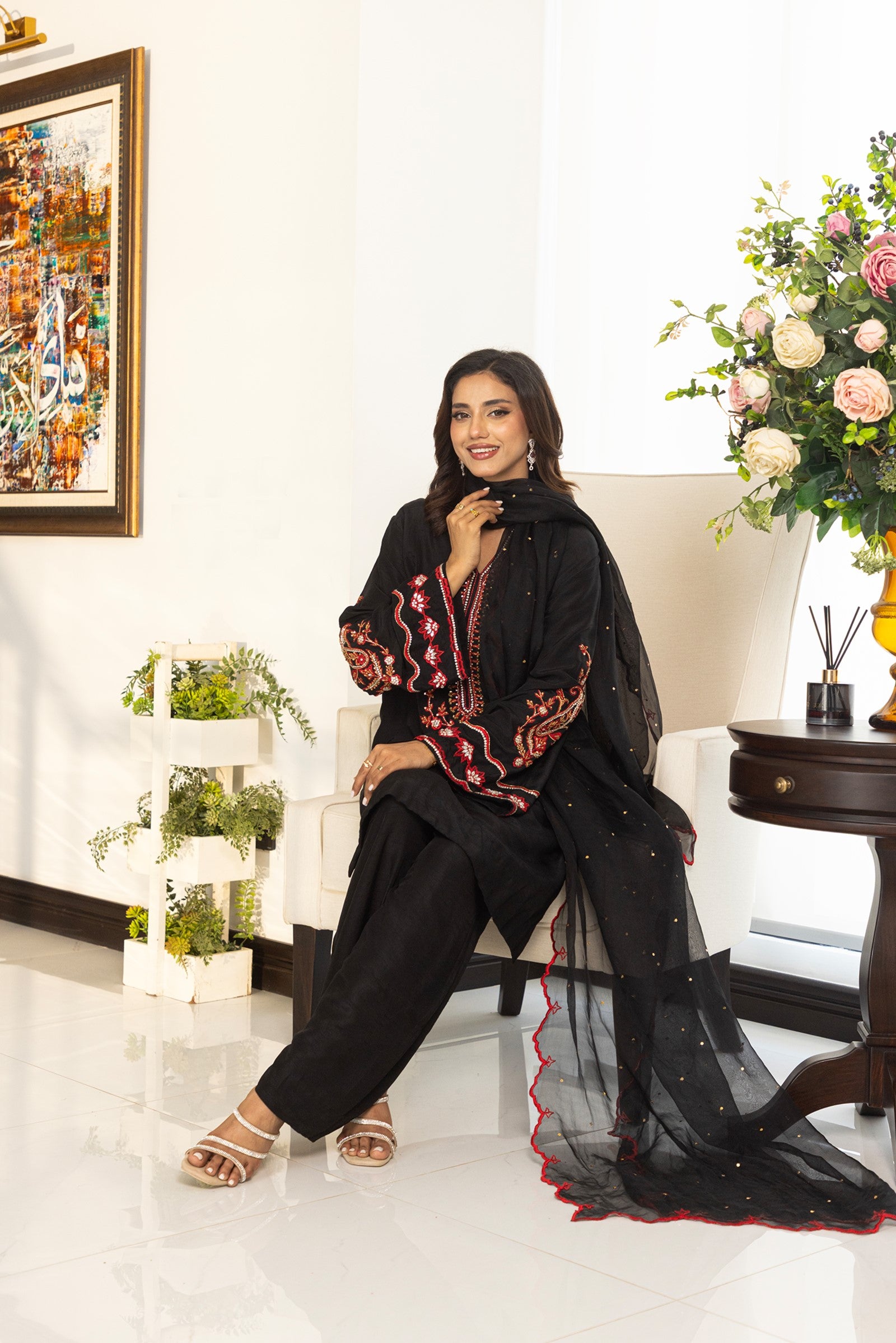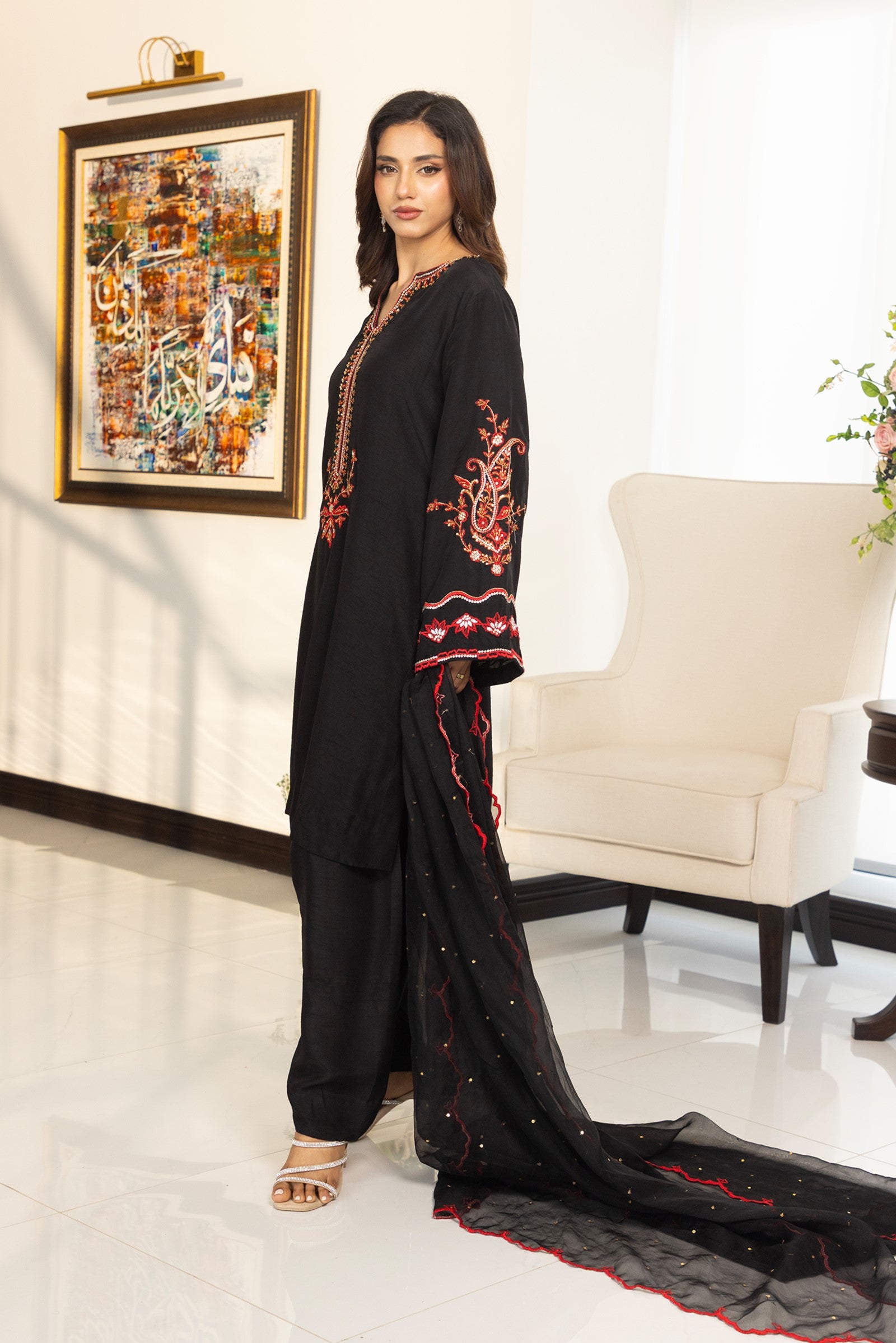 Crafted in Korean raw silk, this elegant 3-piece ensemble features rich red resham embroidery with intricate hand-embellished stones, sequins, cutdana and dabka work on the shirt. Paired with matching Korean raw silk pants and a sheer organza dupatta adorned with resham embroidery and scalloped edges, this outfit is perfect for festive gatherings and evening celebrations.