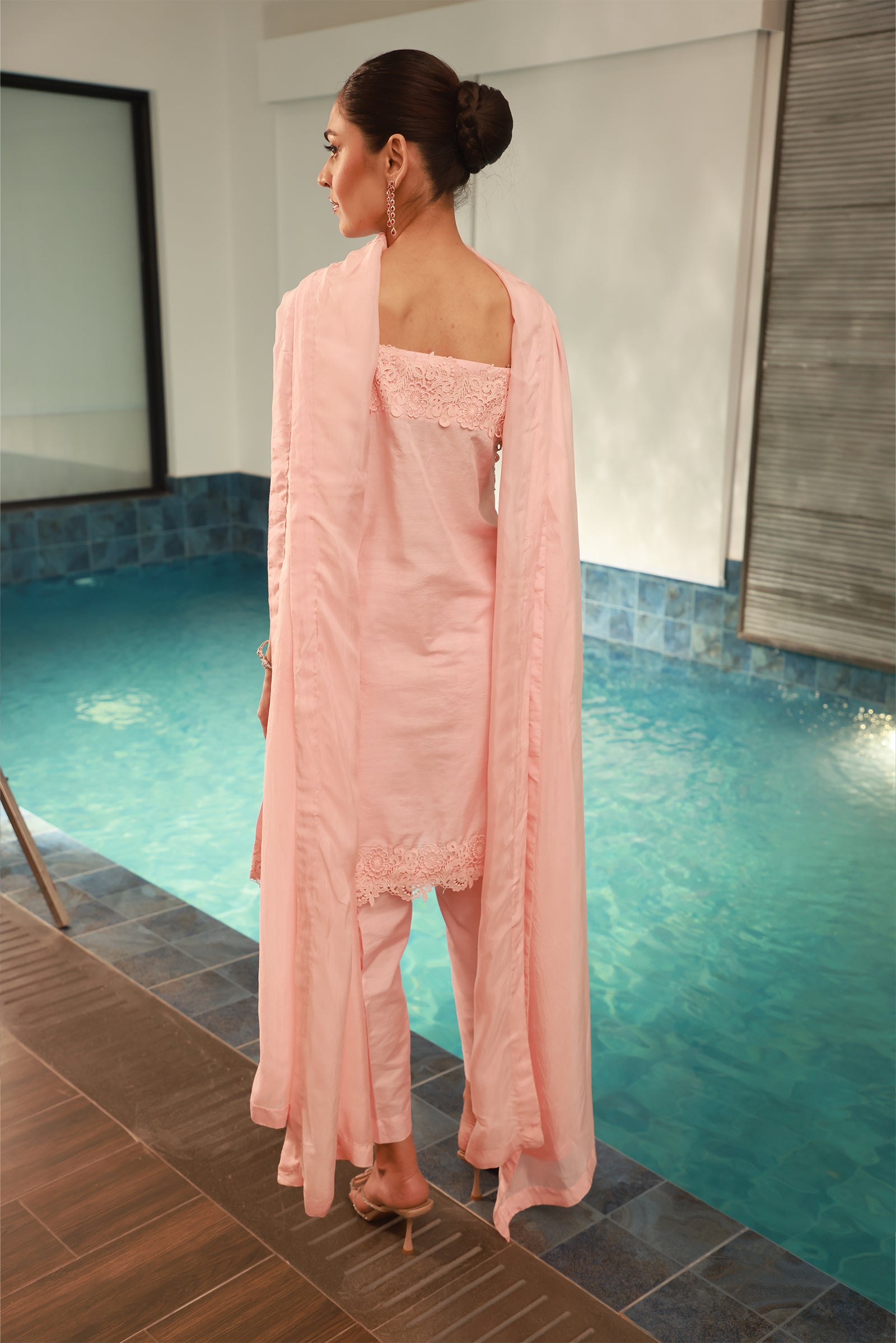 Crafted in khaddi silk, this elegant 3-piece ensemble features refined machine resham embroidery with delicate hand-embellished stones, sequins and cutdana detailing on the shirt. The sleeveless, thin-strap silhouette is paired with matching khaddi silk pants for a modern, graceful look. A silk dupatta completes the set, finished with embroidered detailing along the front neckline panel, mirroring the intricate resham and handwork featured on the shirt.