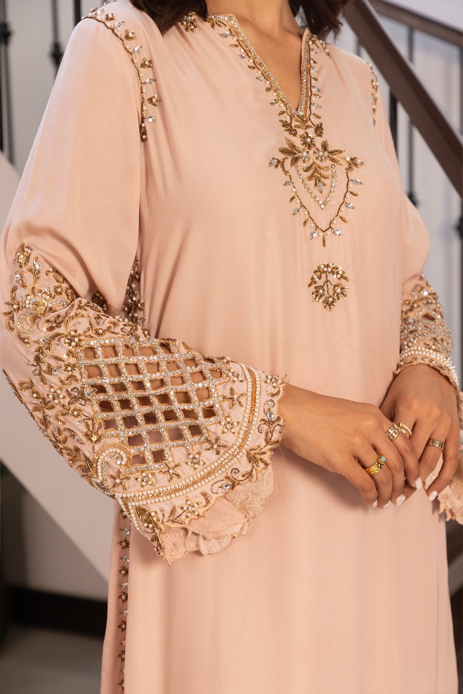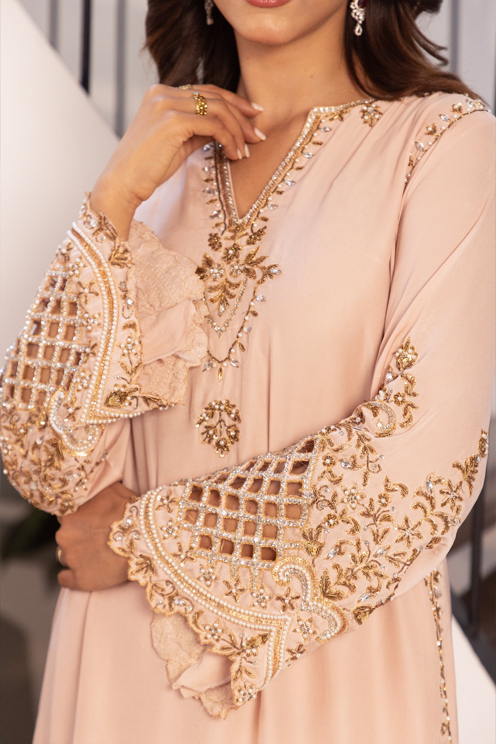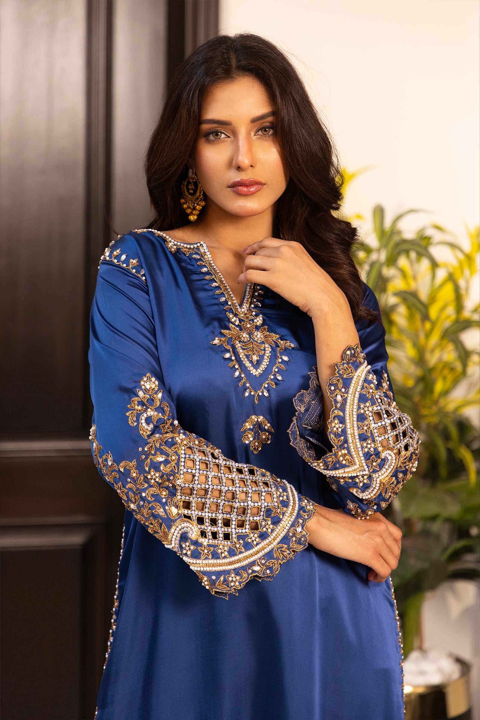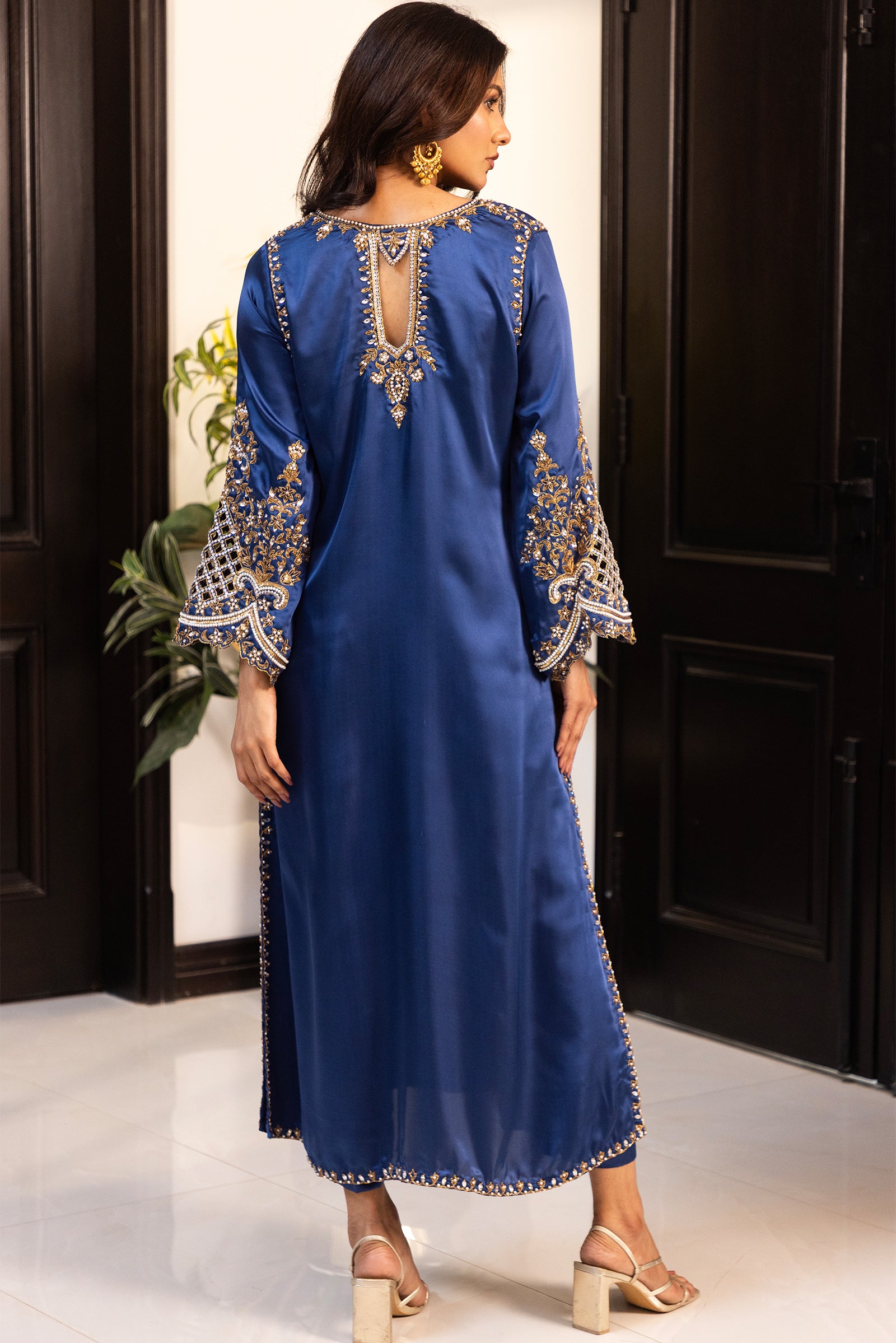 Drape yourself in the ethereal elegance of Shadow, where artistry meets opulence. This kaftan-style full length shirt with sleek straight pants exudes timeless sophistication. Crafted from pure Shamose silk, the shirt flows like liquid gold, whispering luxury with every movement. A true showstopper, its hand-embellished splendor features a breathtaking fusion of dabka, naqshi, sequins, pearls, and stones—a mesmerizing constellation of gold that glows against the silk. Intricate cutwork on the bell style sleeves adds a delicate allure, while delicately hand-embroidered leaves on the shoulders breathe life into the shirt.