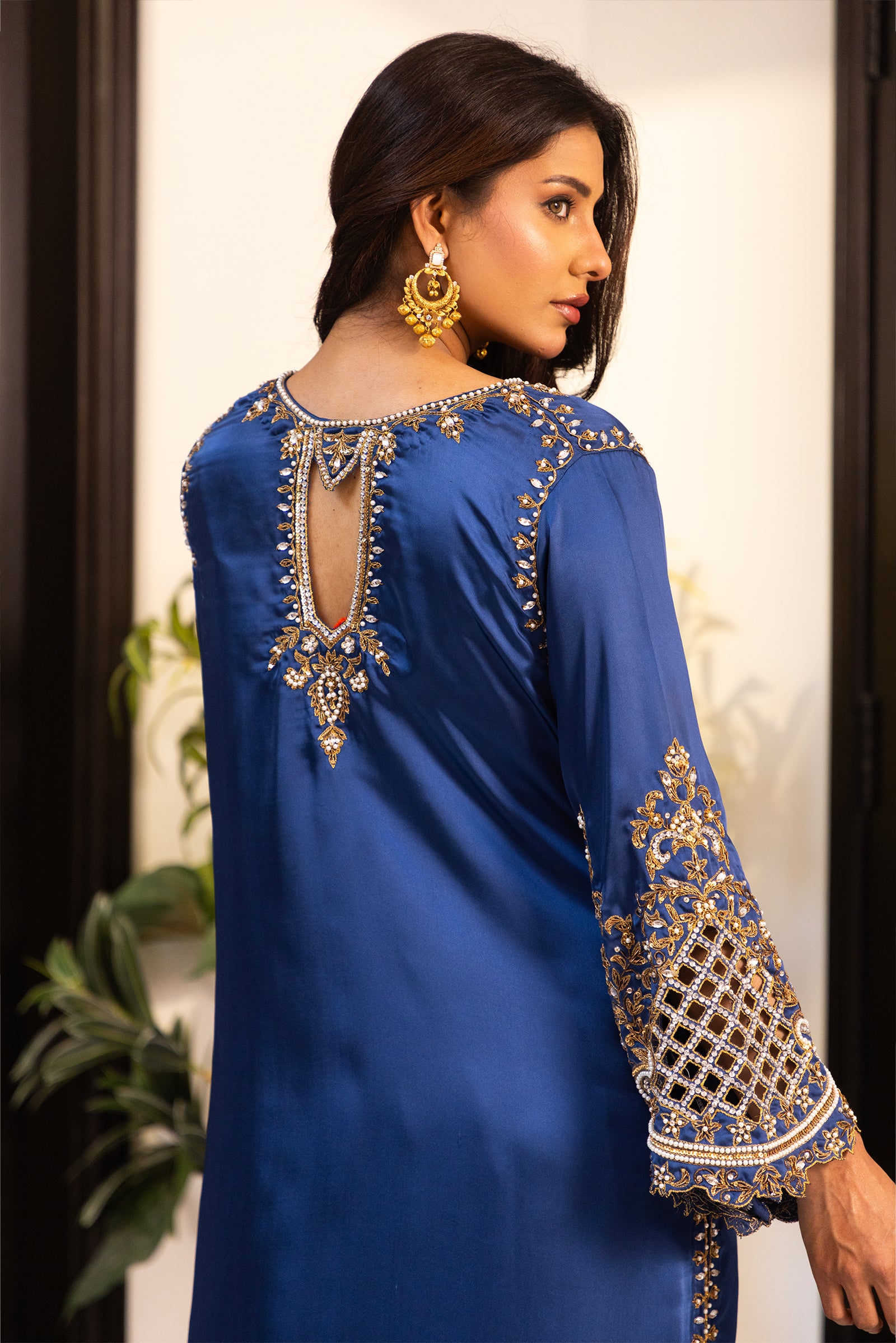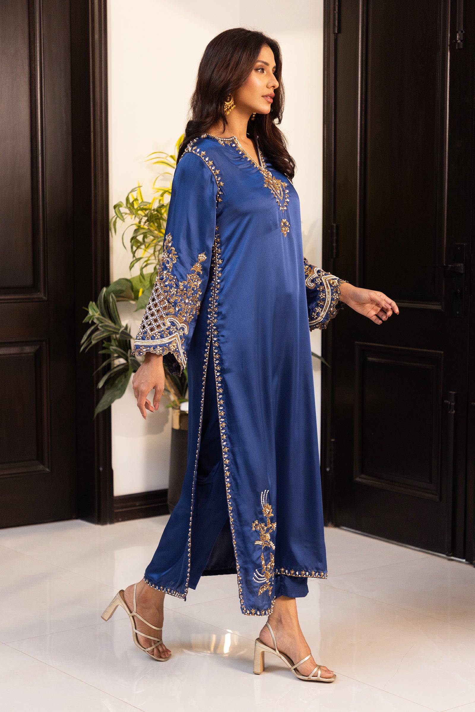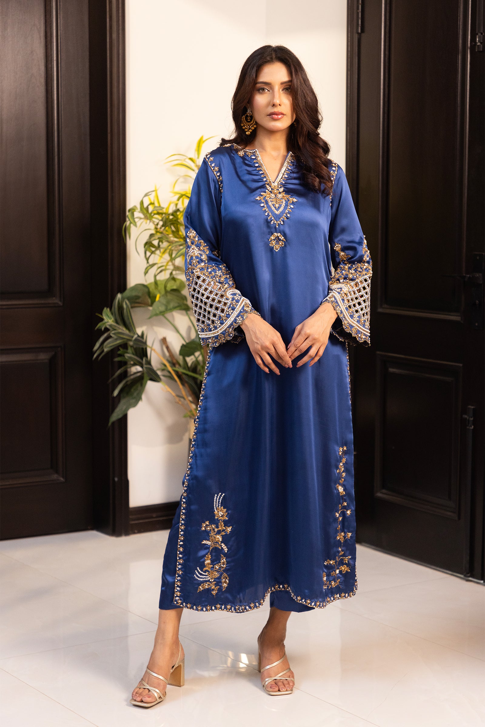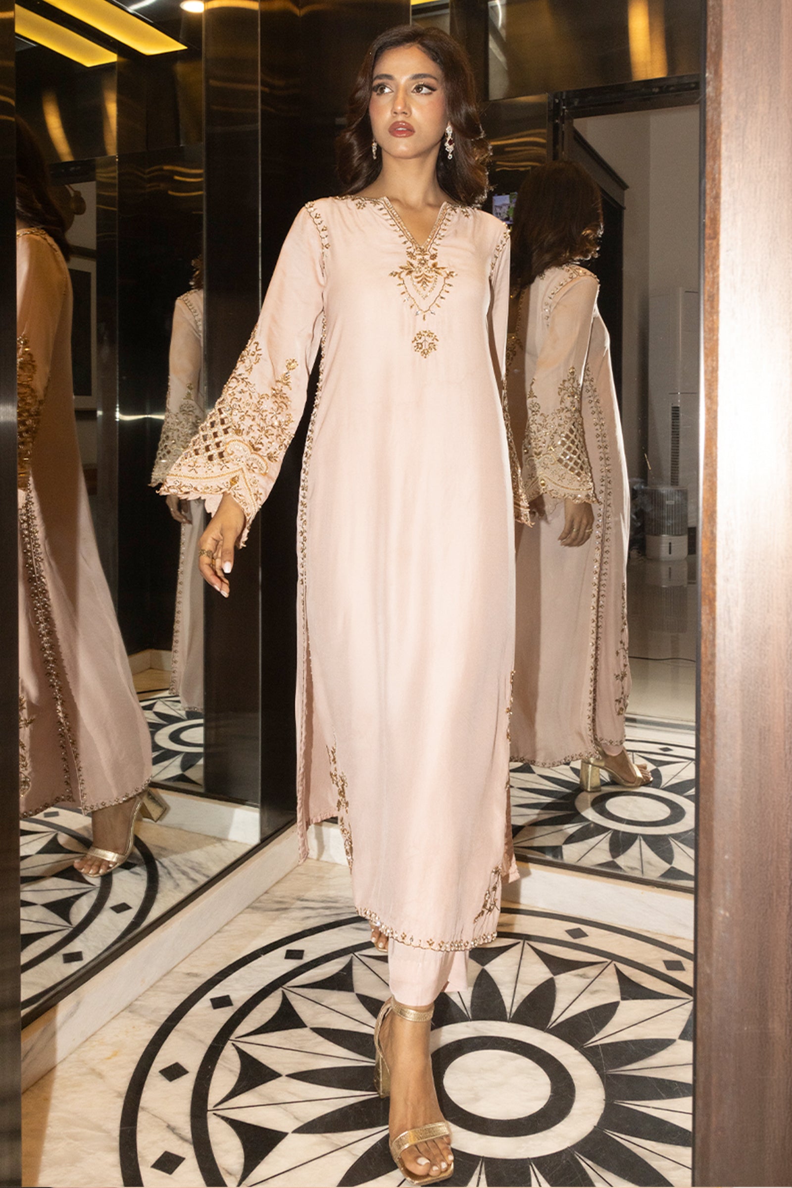 Drape yourself in the ethereal elegance of Shadow, where artistry meets opulence. This kaftan-style full length shirt with sleek straight pants exudes timeless sophistication. Crafted from pure Shamose silk, the shirt flows like liquid gold, whispering luxury with every movement. A true showstopper, its hand-embellished splendor features a breathtaking fusion of dabka, naqshi, sequins, pearls, and stones—a mesmerizing constellation of gold that glows against the silk. Intricate cutwork on the bell style sleeves adds a delicate allure, while delicately hand-embroidered leaves on the shoulders breathe life into the shirt.