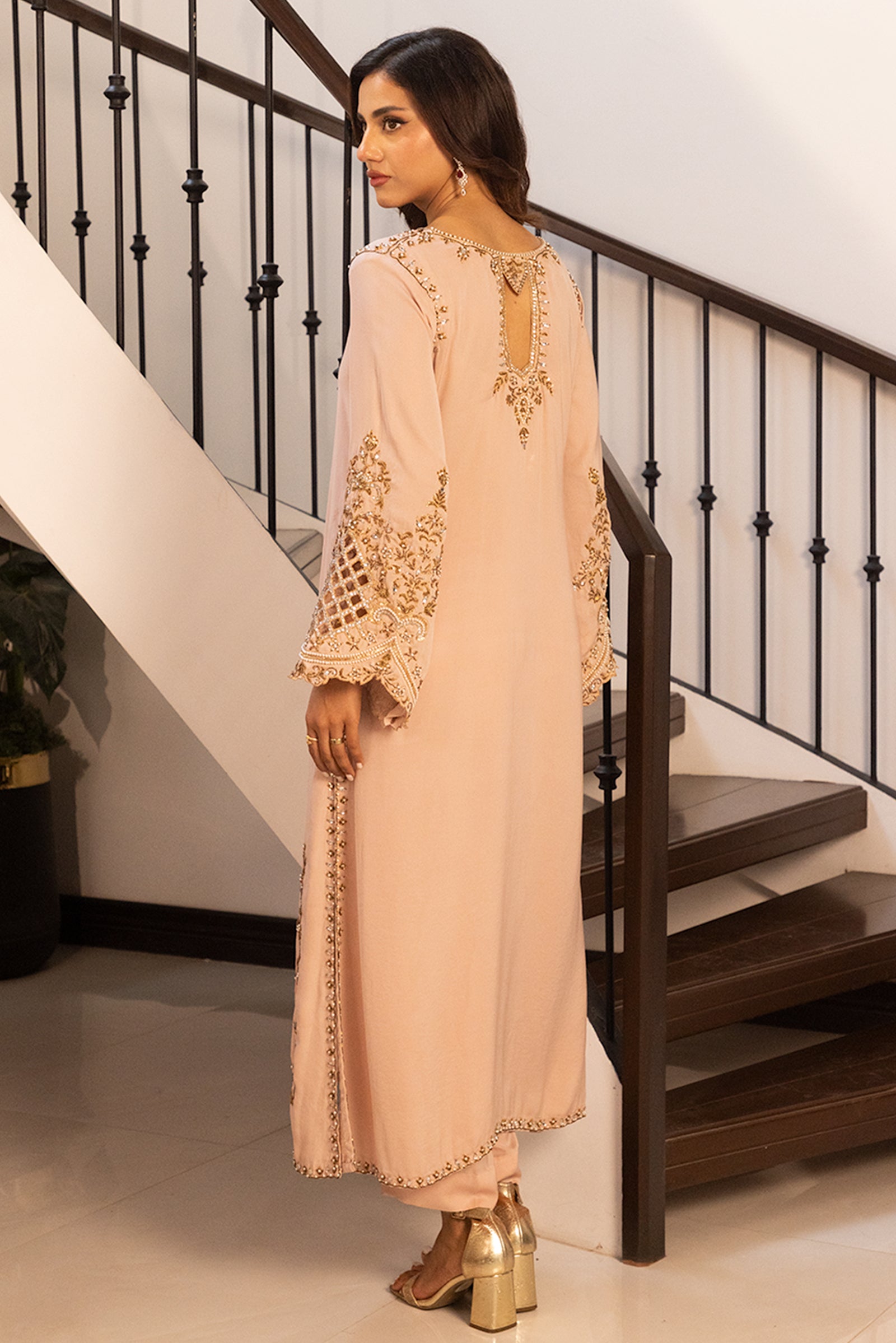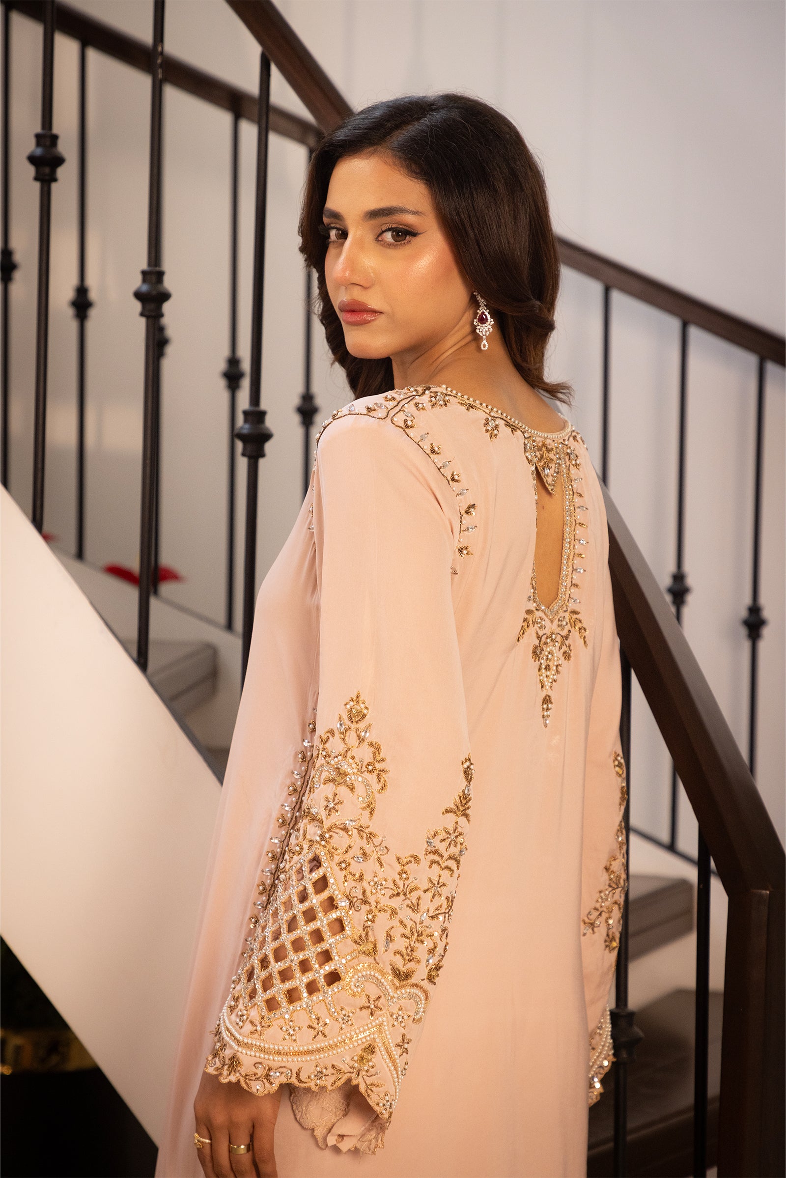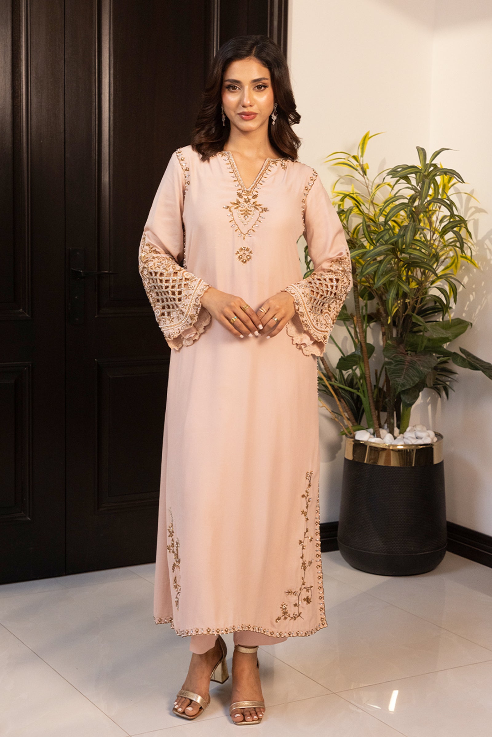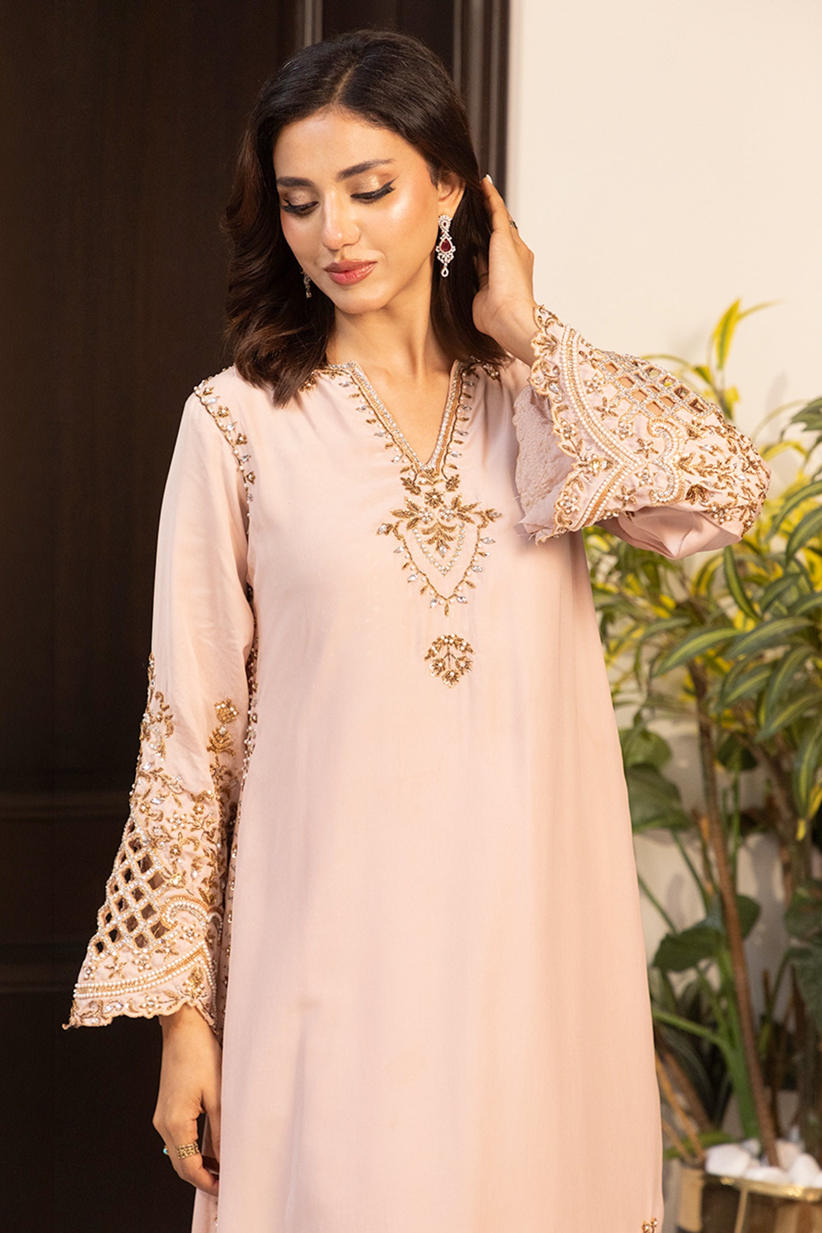 Drape yourself in the ethereal elegance of Shadow, where artistry meets opulence. This kaftan-style full length shirt with sleek straight pants exudes timeless sophistication. Crafted from pure Shamose silk, the shirt flows like liquid gold, whispering luxury with every movement. A true showstopper, its hand-embellished splendor features a breathtaking fusion of dabka, naqshi, sequins, pearls, and stones—a mesmerizing constellation of gold that glows against the silk. Intricate cutwork on the bell style sleeves adds a delicate allure, while delicately hand-embroidered leaves on the shoulders breathe life into the shirt.